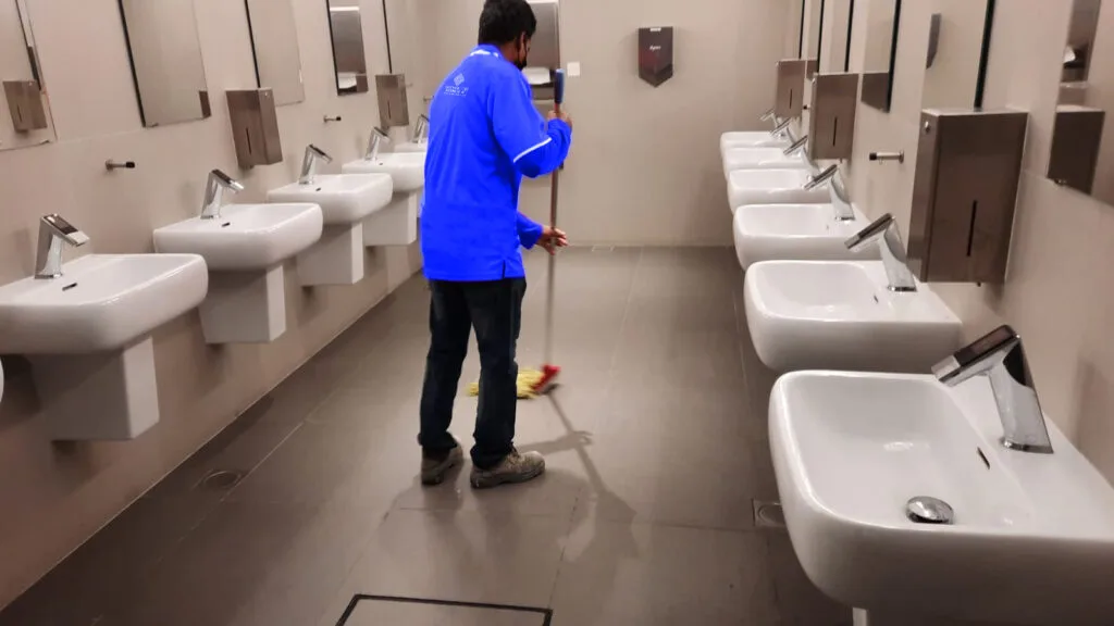 Washroom sink cleaning involves removing dirt, grime, and other contaminants from the surface of the sink using specialized cleaning solutions and tools.